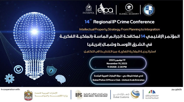 تحت رعاية وحضور معالي الفريق ضاحي خلفان تميم، نائب رئيس الشرطة والأمن العام في دبي، عُقد المؤتمر الإقليمي الرابع عشر لمكافحة جرائم الملكية الفكرية في منطقة الشرق الأوسط وشمال أفريقيا، وذلك بتاريخ ١٩ نوفمبر ٢٠٢٥ في نادي ضباط شرطة دبي. ونُظّم المؤتمر من قبل جمعية الإمارات للملكية الفكرية (EIPA) والإنتربول، بالتعاون مع وزارة الداخلية، ووزارة الاقتصاد والسياحة، وشرطة دبي، وجمارك دبي، ومجلس أصحاب العلامات التجارية، في تأكيدٍ جديد على التزام دولة الإمارات العربية المتحدة الراسخ بحماية حقوق المبدعين وتعزيز منظومة إنفاذ حقوق الملكية الفكرية.