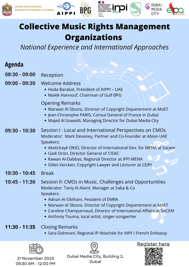 نظّم مجلس أصحاب العلامات التجارية، بالشراكة مع الدائرة الاقتصادية في السفارة الفرنسية لدى دولة الإمارات، والمعهد الوطني الفرنسي للملكية الصناعية (INPI France)، ورابطة AIPPI الإمارات، وجمعية الإمارات للملكية الفكرية (EIPA)، ومدينة دبي للإعلام، الندوة الأولى بعنوان «منظمات الإدارة الجماعية لحقوق الموسيقى»، وذلك تحت رعاية وزارة الاقتصاد والسياحة في دولة الإمارات العربية المتحدة.