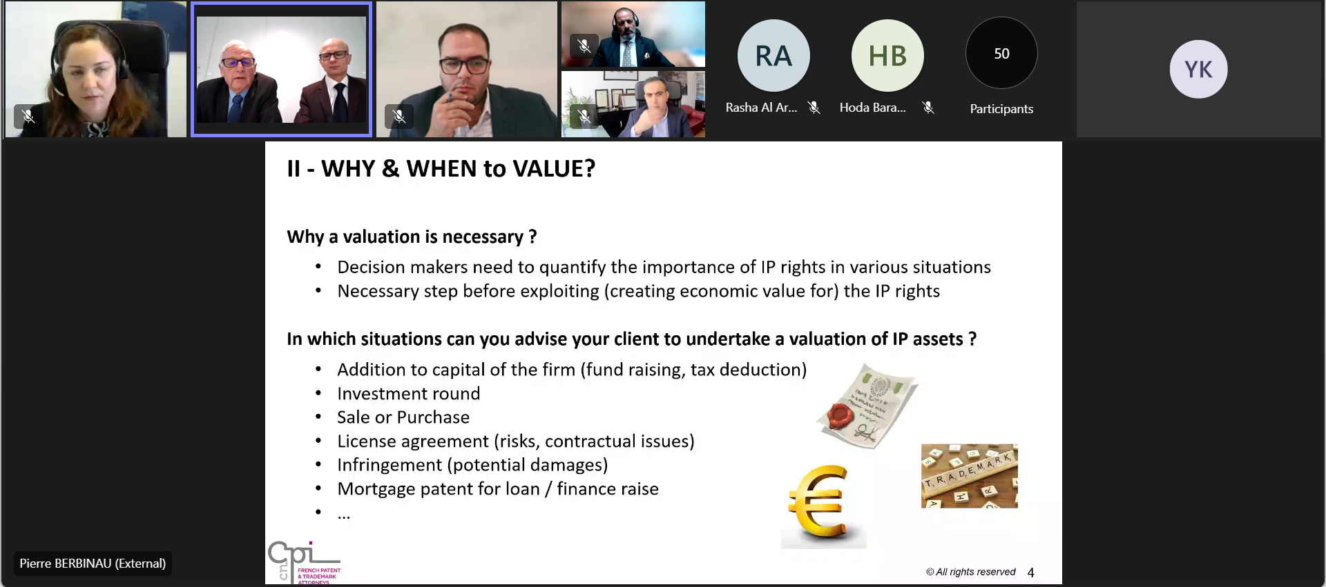 The webinar covered various topics related to IP Asset Valuation, each presented by a prominent expert in the field. The first topic discussed was the Principles of IP Valuation in Europe, presented by Dr. Pierre Berbinau, Co-President of the International relations Committee of the CNCPI, European, and French Patent Attorney, CNCPI, France and Mr. William Hammond, Co-President of the Committee of the Fiscality and IP Financial valuation of the CNCPI, European, and French Patent Attorney, CNCPI, France.