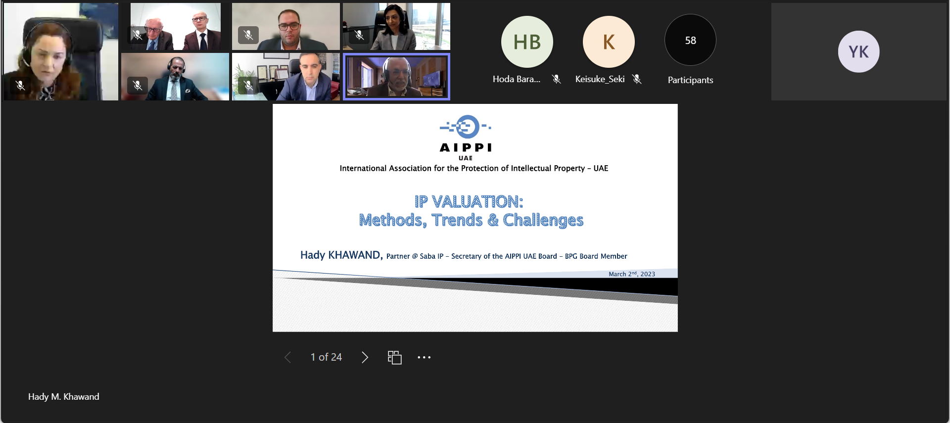 On March 2nd, 2023, a highly informative webinar on IP Asset Valuation was held online via Teams. The event was organized by Gulf BPG – Brand Owners Protection Group, AIPPI-UAE – International Association for the Protection of Intellectual Property in the UAE, Economic Service – French Embassy in UAE; French National Institute for Industrial Property (INPI) – France, EIPA – Emirates Intellectual Property Association, and the Ministry of Economy – Department of Trademarks and Copyright – UAE.